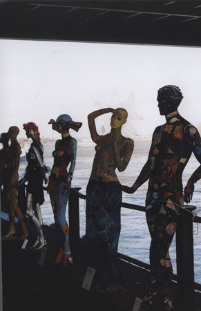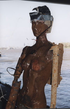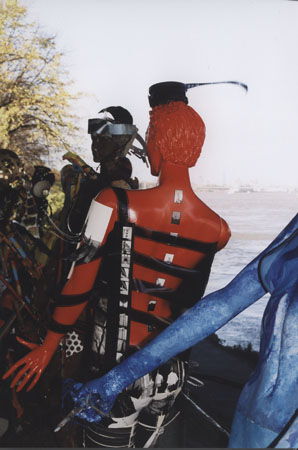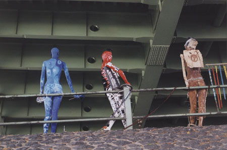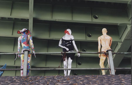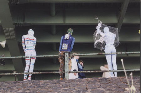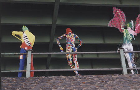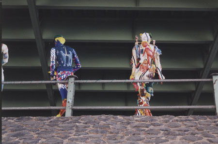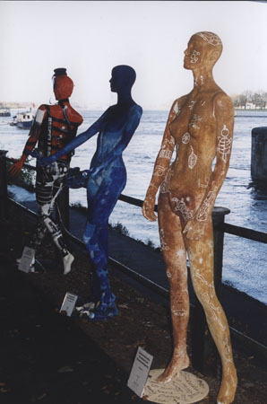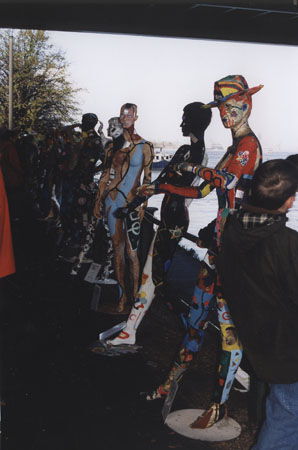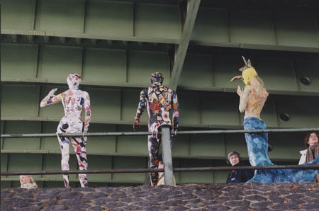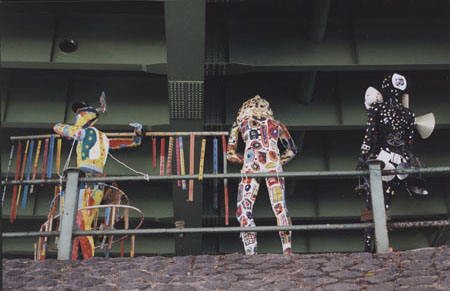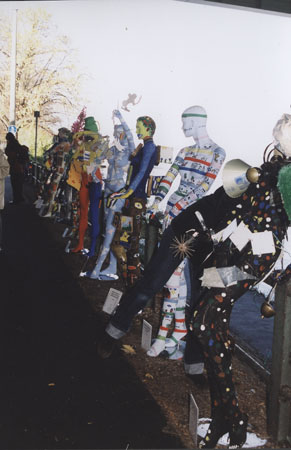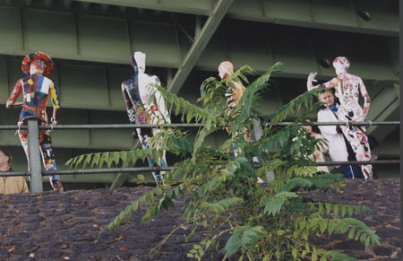eine Reihe phantastischer Gestalten, die am 27.10.2002 die als "Menschenkette" der besonderen Art am Rhein ausgestellt wurden.